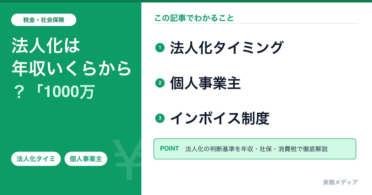 法人化の目安「年収1000万円」は古い。2026年現在、課税所得800万円超+インボイス対応で年収600万円台から検討の余地。段階的判断フロー・シミュレーション・注意点を解説。