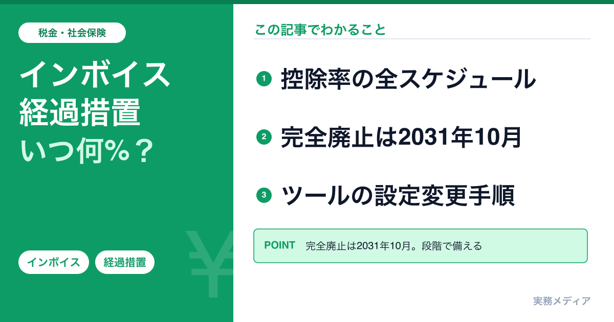 令和8年度税制改正大綱により決定したインボイス経過措置の完全スケジュール(2026年10月〜2031年10月)を解説。控除割合が80%→70%→50%→30%→0%と段階縮小。freee・マネーフォワードの設定変更手順も掲載。