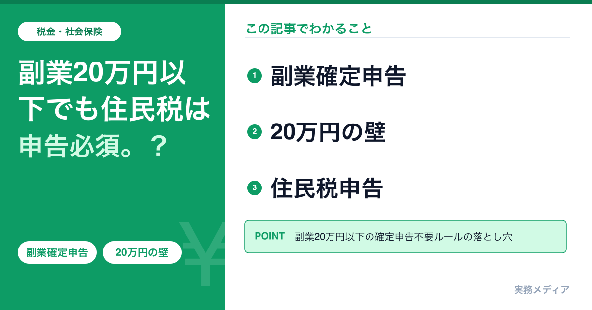副業所得20万円以下なら確定申告不要は「所得税だけ」の話。住民税は別途申告が必要で、怠ると無申告加算税は最大40%。申告方法により5〜20%の加算税が課される。副業収入がいくらでも必要な住民税申告と、バレるリスクを解説。